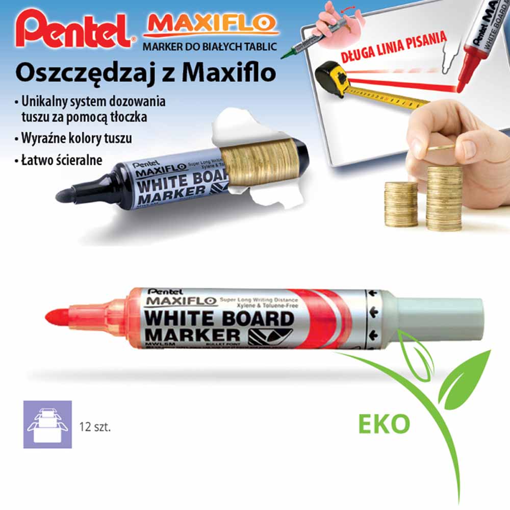 Wyraźne kolory tuszu i łatwość ścierania sprawiają, że marker Pentel MWL5M Maxiflo jest idealnym narzędziem do codziennego użytku na tablicach suchościeralnych.