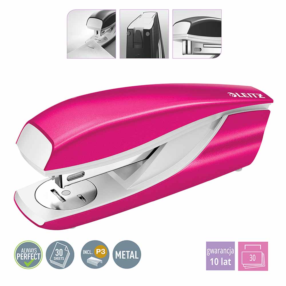 Zszywacz wyposażony jest w wskaźnik ilości zszywek, dzięki któremu zawsze będziesz wiedzieć, kiedy nadejdzie czas na ich wymianę. Dodatkowo, podstawa nierysująca podłoża zapewnia stabilność podczas zszywania i chroni powierzchnie biurka przed zarysowaniami.