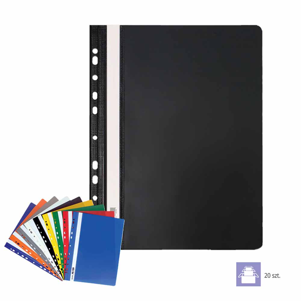 Boczna perforacja pozwala na łatwe wpięcie skoroszytu do segregatora z dowolnym mechanizmem, co zwiększa możliwości organizacji i archiwizacji dokumentów. Wewnętrzna blaszka i wąs o długości 14,5 cm umożliwiają bezpieczne przechowywanie dokumentów o grubości do 20 mm.