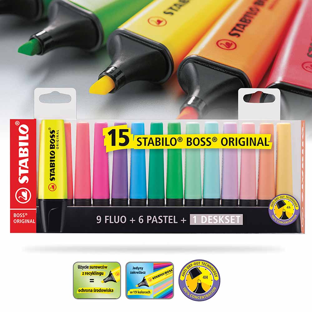 STABILO BOSS ORIGINAL dba o środowisko - wszystkie czarne elementy zakreślaczy wykonane są z plastiku pochodzącego z recyklingu. Zakreślacze są również łatwe do ponownego napełnienia, co redukuje ilość odpadów.