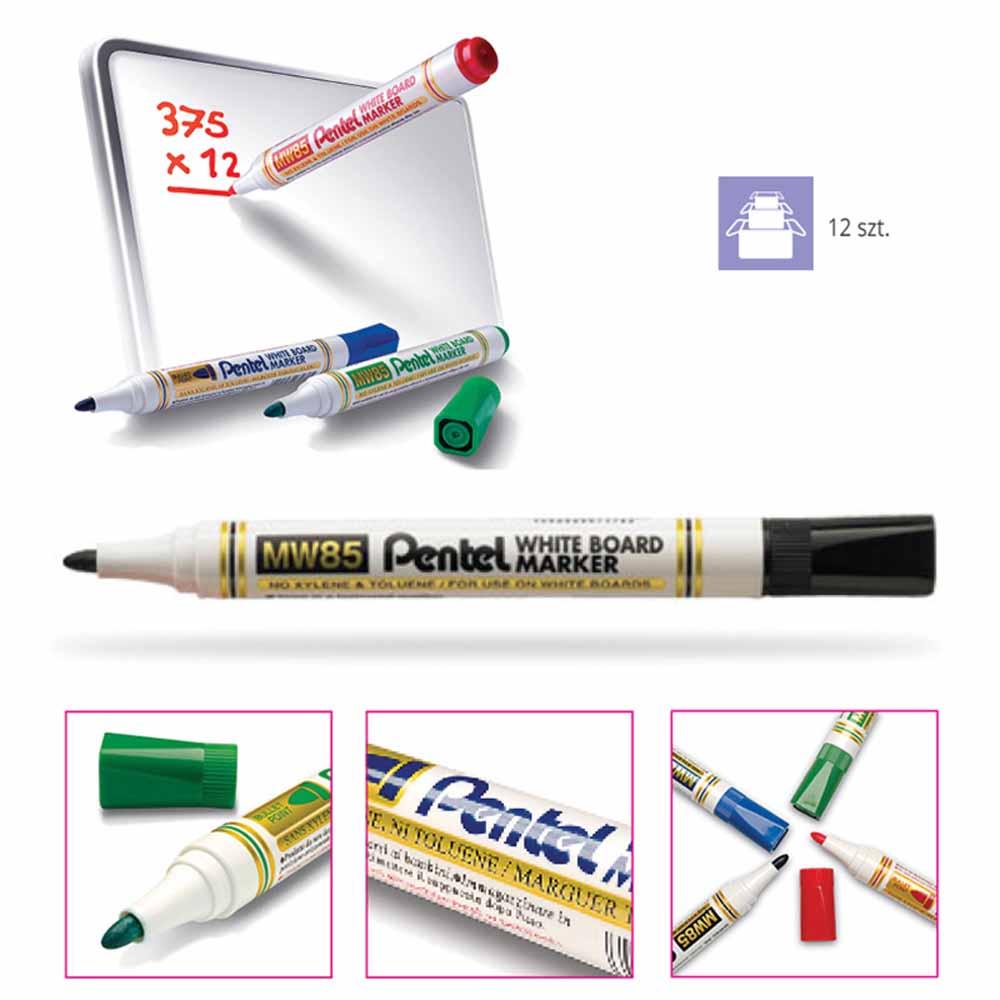 Marker do tablic suchościeralnych Pentel MW85 wyposażony jest w okrągłą końcówkę, która zapewnia precyzyjne i płynne pisanie. Idealny do prezentacji, notatek i rysunków na tablicach suchościeralnych.