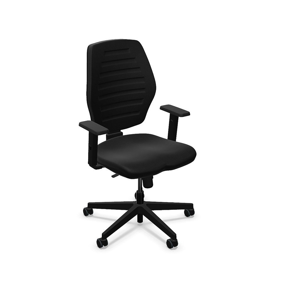 wygodny fotel biurowy z pokryty ekoskórą, tapicerowany w klasyczne, poziome pasy miękkie, wypełnione pianką siedzisko mechanizm motylkowy (TILT) dający możliwość swobodnego kołysania oraz blokady pozycji do pracy stałe podparcie lędźwiowego odcinka kręgosłupa chromowane podłokietniki z miękkimi nakładkami zapewniająca stabilność pięcioramienna, stalowa, chromowana podstawa podnośnik gazowy (siłownik): 100 mm kółka nylonowe, twarde, do wszystkich typów podłóg - średnica 50 mm materiał: ekoskóra wysokość krzesła: 108- 118 cm regulacja wysokości siedziska w zakresie: 47,5 – 57,5 cm szerokość oparcia: 48 cm wysokość oparcia: 64 cm szerokość siedziska: 51 cm głębokość siedziska: 44 cm średnica podstawy: 64 cm maksymalne obciążenie: 110 kg rekomendowany czas siedzenia: do 8 godzin dziennie gwarancja: 2 lata kolor: czarny