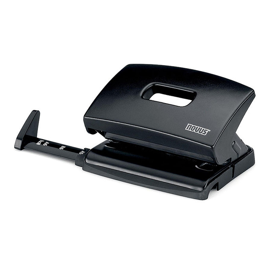 dziurkacz do 30 kartek 80g mechanizm i obudowa metalowe bolce dziurkujące ze stali nierdzewnej głębokość wsuwania kartek: 12mm odstęp pomiędzy dziurkami: 80mm średnica dziurki: 5,5mm ogranicznik formatu: Q1, US-Quart, 888, Folio, A4, A3-E, A5, A6, B5, B6, Ex antypoślizgowa plastikowa nakładka na podstawę wskaźnik środka strony posiada blokadę ramienia w postaci wyjmowanego plastikowego ogranicznika na dziurkaczu nadrukowana nazwa marki pakowany po 1szt. w kartonowe pudełko gwarancja 10 lat kolor: czarny