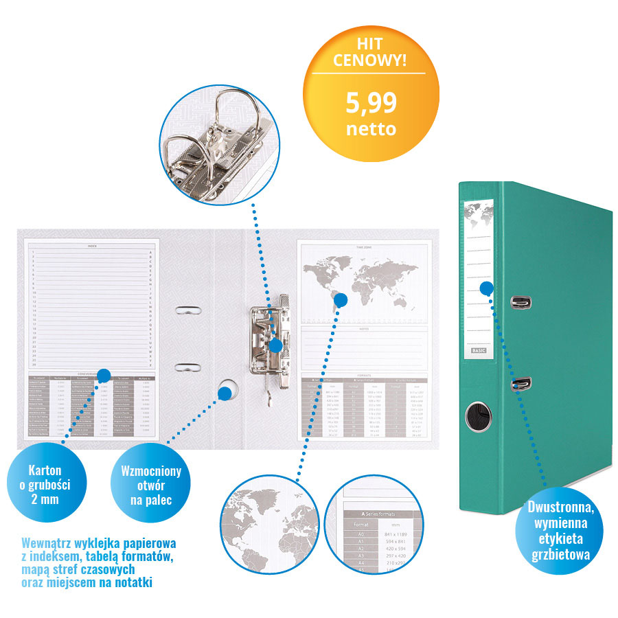 Wewnątrz znajduje się papierowa wyklejka z przydatnymi informacjami, takimi jak indeks, tabela formatów, mapa stref czasowych oraz miejsce na notatki. Dodatkowe udogodnienia to dolna listwa wzmacniająca, wzmocniony otwór na palec oraz dwustronna, wymienna etykieta grzbietowa, ułatwiająca identyfikację zawartości.