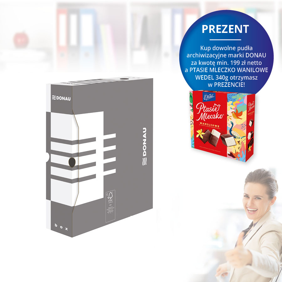Pudło archiwizacyjne DONAU wyróżnia się nowoczesnym designem, który pozwala na ustawienie zarówno na krótszym, jak i dłuższym boku, co zwiększa elastyczność organizacji przestrzeni biurowej. Posiada 5 ścian opisowych, co ułatwia identyfikację zawartości i poprawia organizację w biurze.