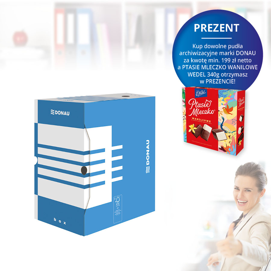 jm.: szt Kup dowolne pudła archiwizacyjne marki DONAU za kwotę min. 199 zł netto a PTASIE MLECZKO WANILOWE WEDEL 340g otrzymasz w PREZENCIE !