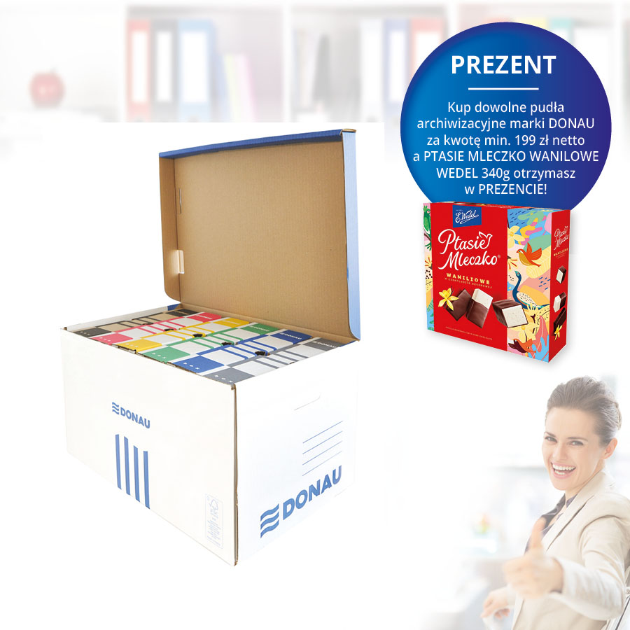 jm.: szt Kup dowolne pudła archiwizacyjne marki DONAU za kwotę min. 199 zł netto a PTASIE MLECZKO WANILOWE WEDEL 340g otrzymasz w PREZENCIE !