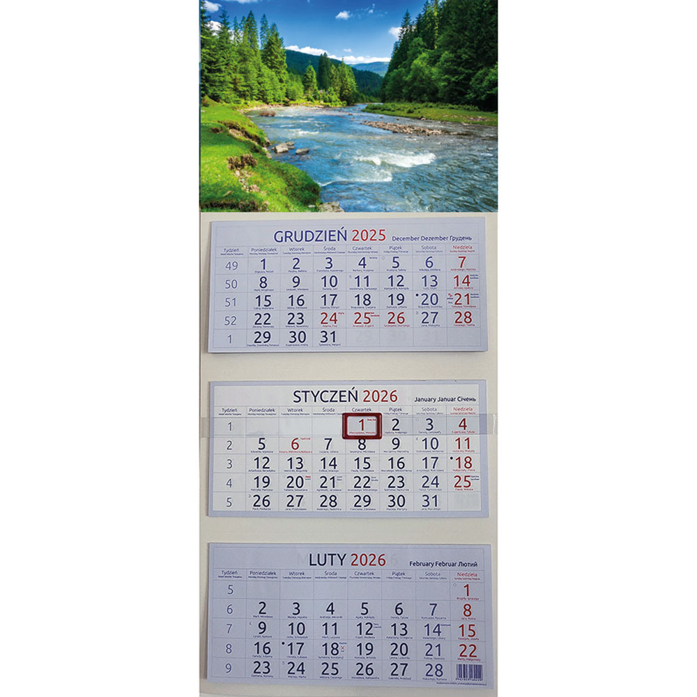 - kalendarium: PL/EN/DE/RUS/FR, imieniny i święta, fazy księżyca i zachody słońca, na dole kalendarium plan całego roku