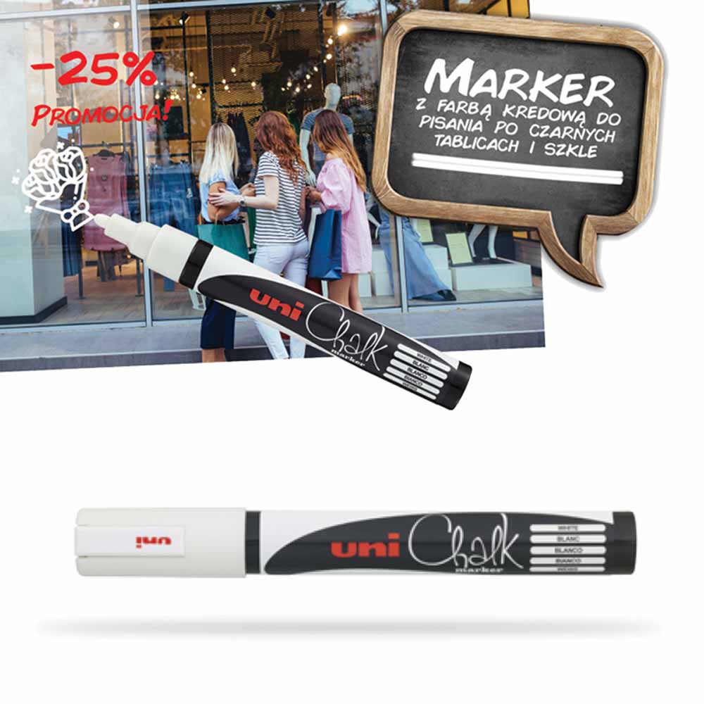 Marker UNI PWE5M oferuje grubość linii pisania od 1,8 do 2,5 mm, co zapewnia wyraźne i czytelne oznaczenia. Idealny do tworzenia eleganckich napisów i rysunków na tablicach kredowych i szkle.