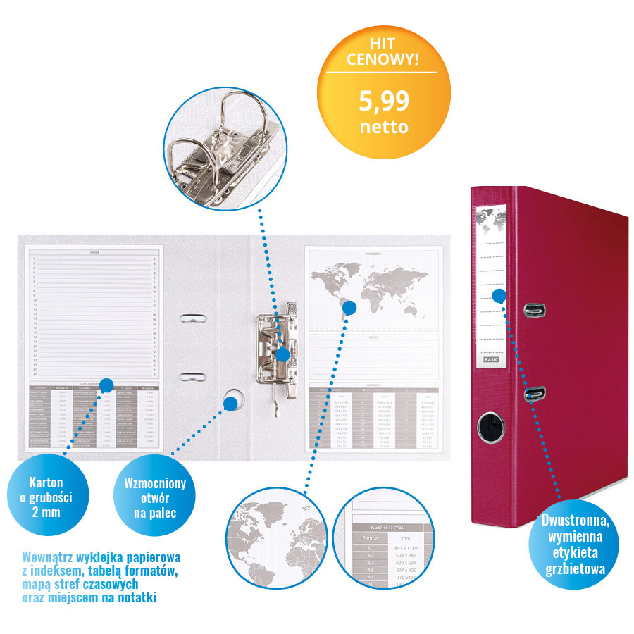 Wewnątrz znajduje się papierowa wyklejka z przydatnymi informacjami, takimi jak indeks, tabela formatów, mapa stref czasowych oraz miejsce na notatki. Dodatkowe udogodnienia to dolna listwa wzmacniająca, wzmocniony otwór na palec oraz dwustronna, wymienna etykieta grzbietowa, ułatwiająca identyfikację zawartości.