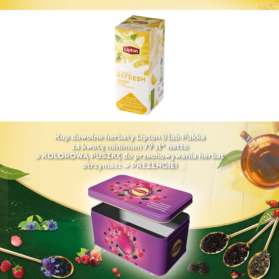jm.: opakowanie Kup dowolne herbaty Lipton i/lub Pukka za kwotę minimum 79 zł* netto a KOLOROWĄ PUSZKĘ do przechowywania herbat otrzymasz w PREZENCIE!