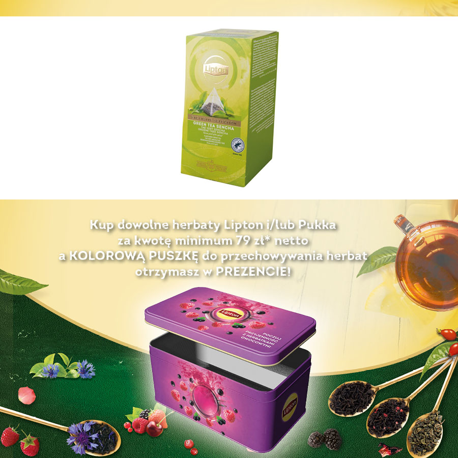 jm.: opakowanie Kup dowolne herbaty Lipton i/lub Pukka za kwotę minimum 79 zł* netto a KOLOROWĄ PUSZKĘ do przechowywania herbat otrzymasz w PREZENCIE!