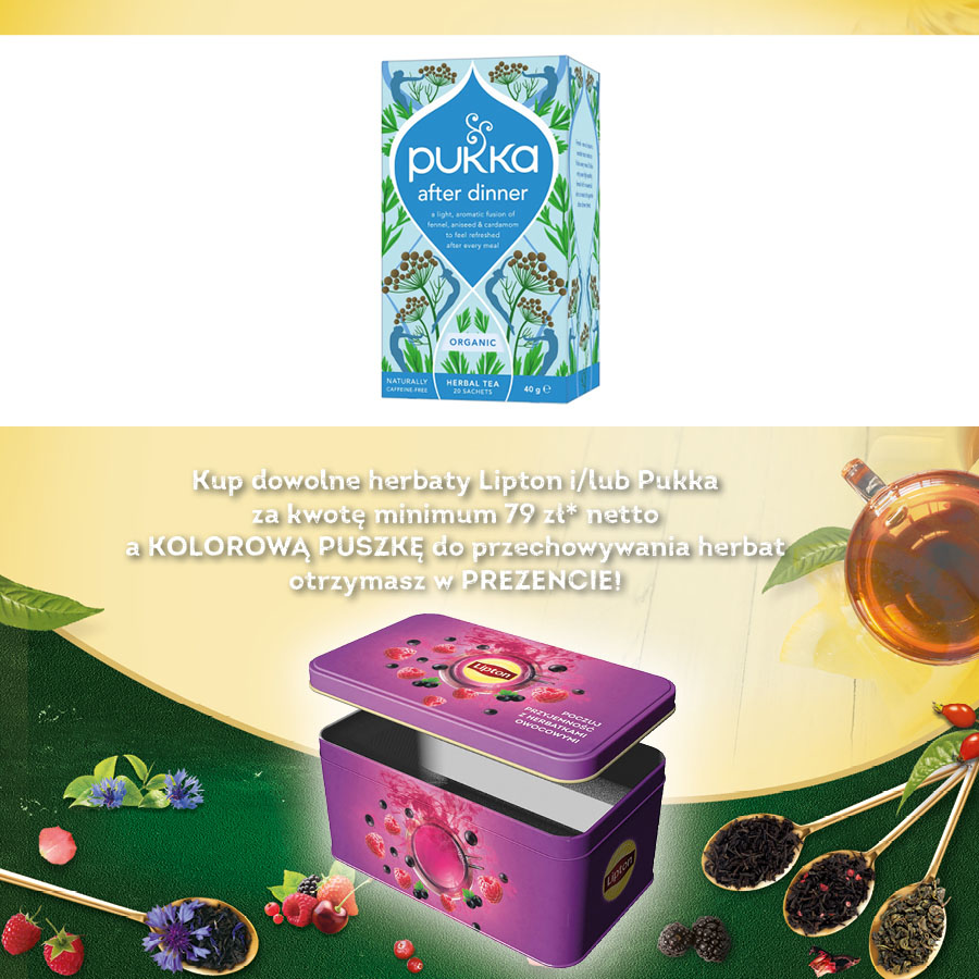 jm.: opakowanie Kup dowolne herbaty Lipton i/lub Pukka za kwotę minimum 79 zł* netto a KOLOROWĄ PUSZKĘ do przechowywania herbat otrzymasz w PREZENCIE!
